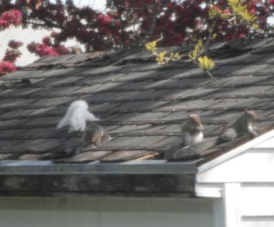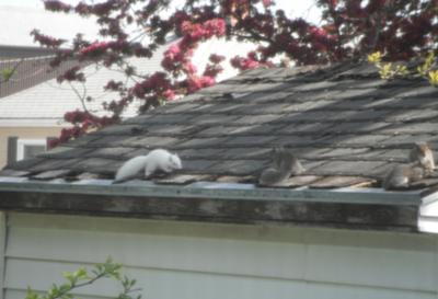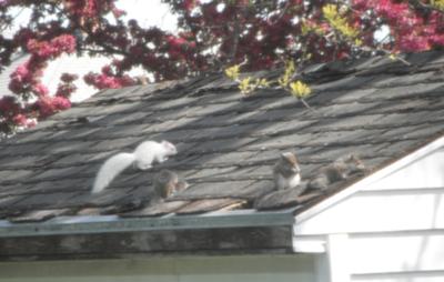 We have seen a baby white Squirrel popping out of the neighbour's shed roof along with some baby Grey Squirrels.